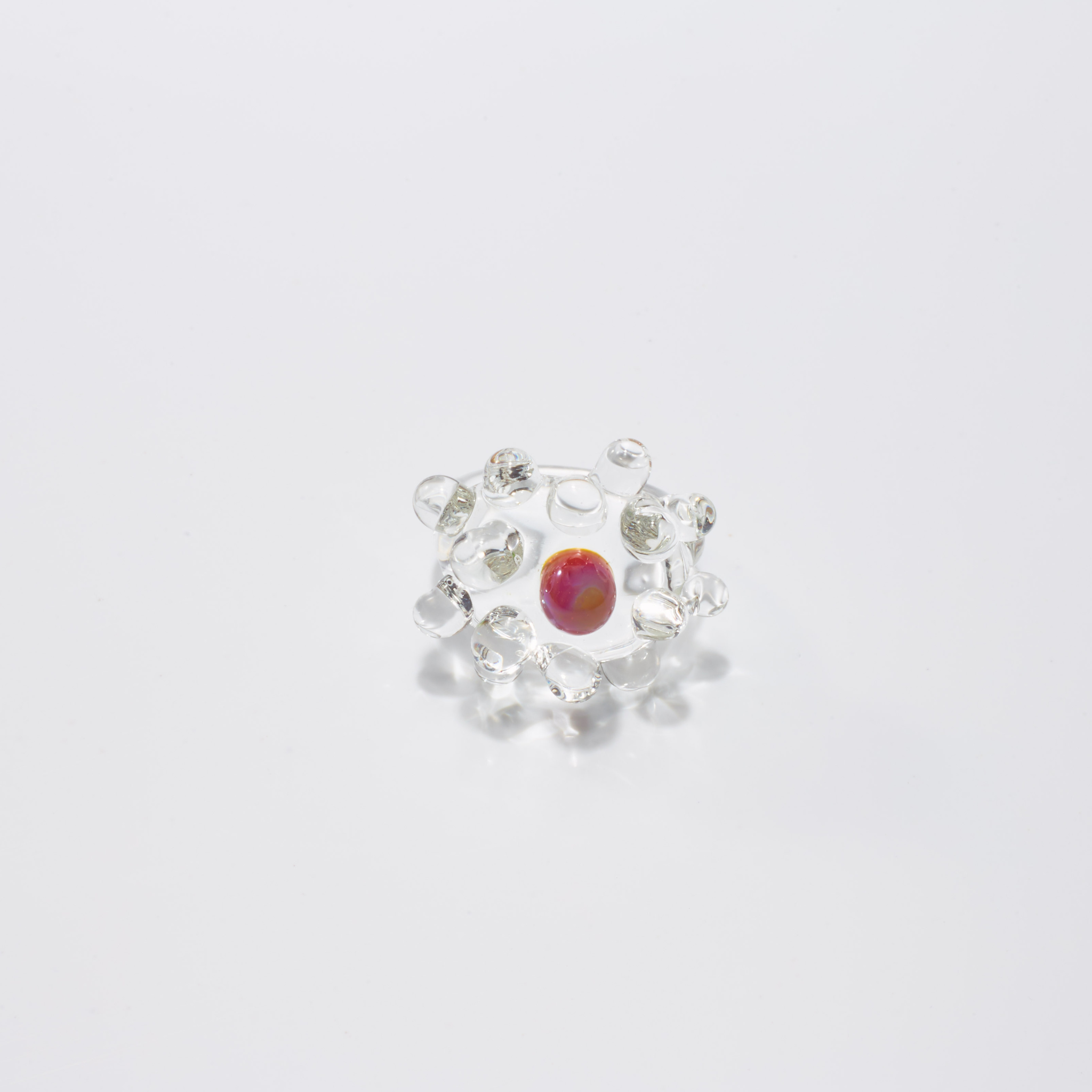 A classic reimagined through Vold’s playful lens. This ring takes the shape of a donut, but with a flirty, modern twist: a transparent dotted “frosting” around the edge and a pink, color-blended center. A fun and charming piece, perfect to sweeten any look.
